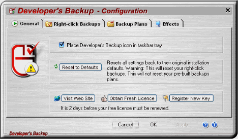 - Place Icon in Taskbar Tray - When checked on, keeps the Developer's Backup 2 software running for quick access to all configuration settings.